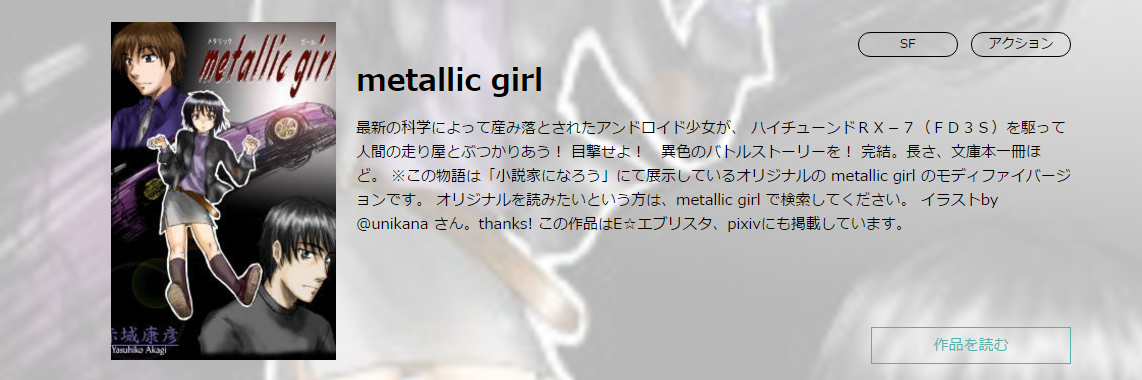 metallic girl という小説を書いていました。走り屋の世界にアンドロイド少女をぶち込むという、今思えばなんとも荒唐無稽なお話でした。