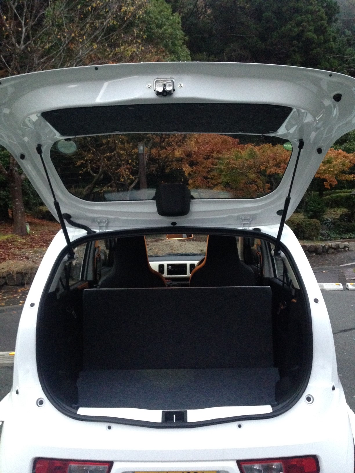 ハッチを開ければ、後部座席の犠牲(笑)のおかげで、収納スペースは広いです。ハッチも私(170センチ)の頭の上まで来て、雨もしのげます。