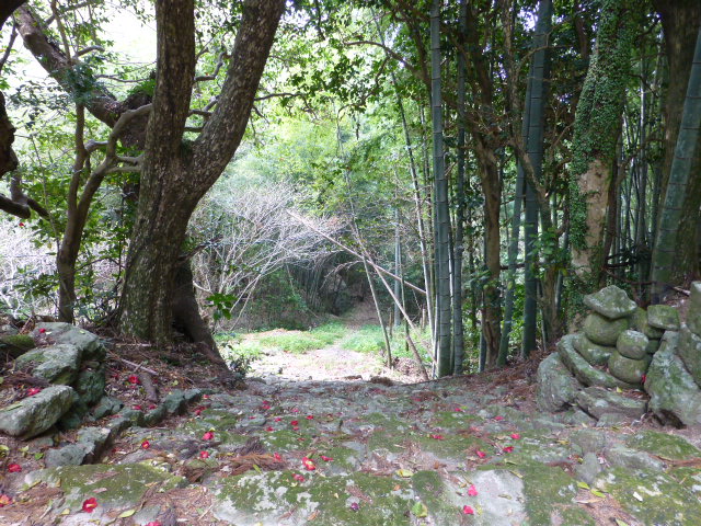 道からそのままお寺の境内に入ってゆくのですが、石段があり下りることができます。が、行き止まりでした…。新しい道ができて従来の道は廃道になったのでしょうか。