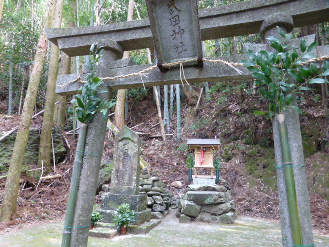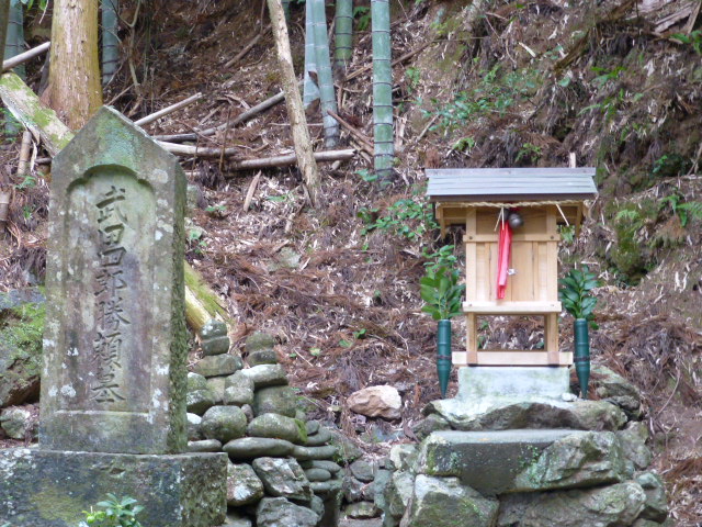けもの道をくだれば、鳥居と祠とともに、武田四郎勝頼の名が刻まれたお墓がありました。